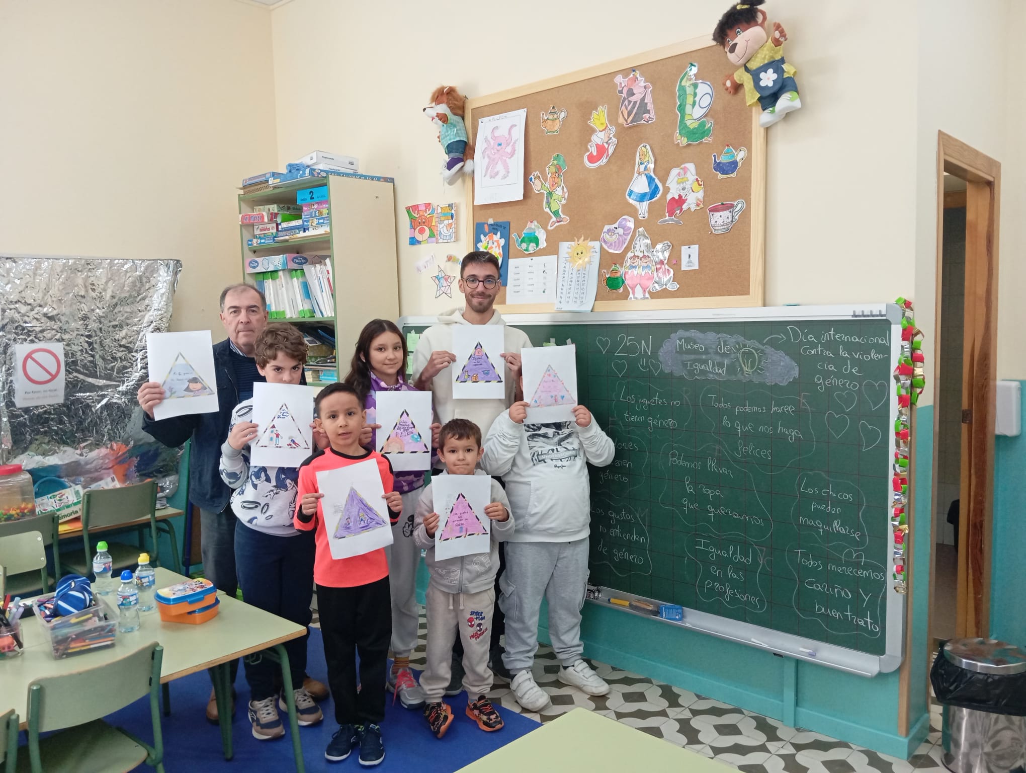 La actividad en cuestión consistía en realizar una pequeña lluvia de ideas por la igualdad que realizamos al inicio de la jornada escolar, en la que los alumnos y alumnas aportaron ideas o mensajes como "Los juguetes no tienen género", "Los colores no tienen género" o "Todos y todas podemos hacer lo que nos haga sentir felices". Una vez ideados estos mensajes, llegaba el momento de plasmarlos de manera creativa y original, en forma de señales de tráfico decoradas de manera libre por el alumnado, las cuales servirán para realizar un mural en una actividad futura.